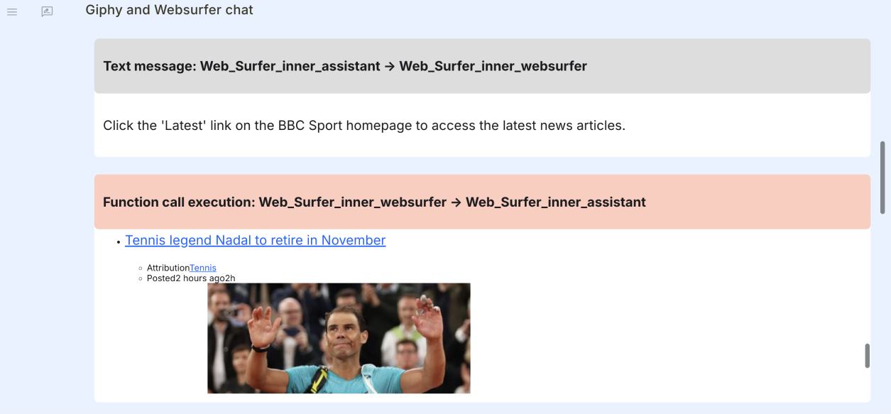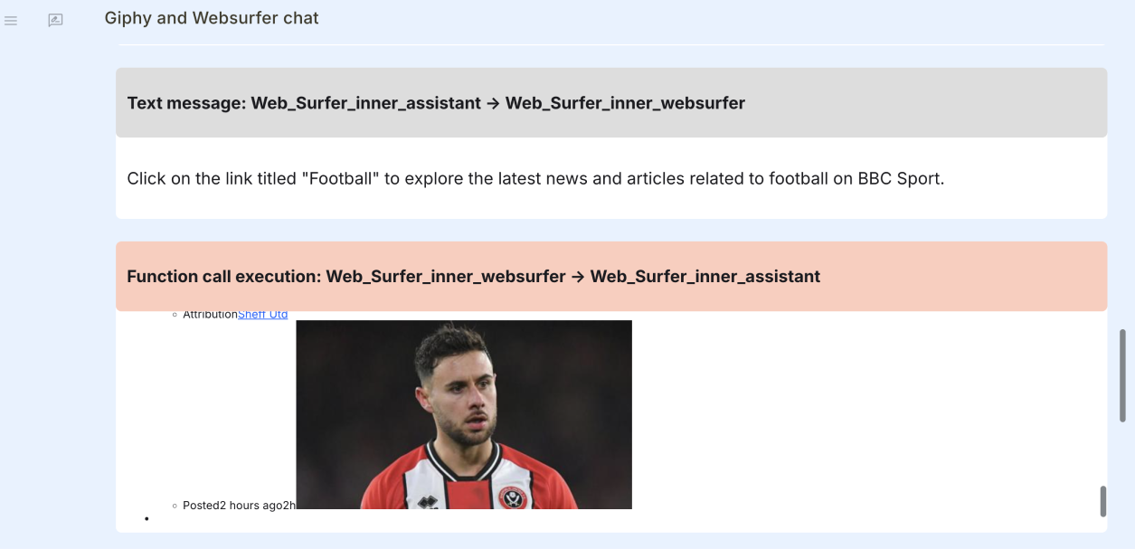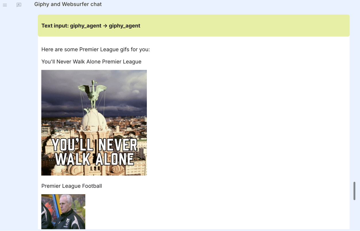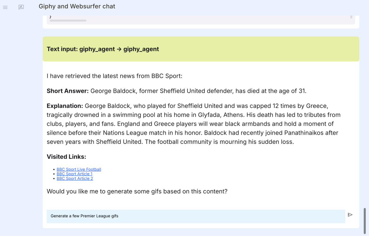Once the scraping is complete, the agents deliver their findings to the user. In the final step, the user asks for a few Premier League GIFs, which Giphy agent promptly provides.
