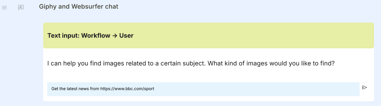 This is a core function used by the Giphy agent to either present the task result or ask a follow-up question to the user. The message is wrapped in a TextInput object, and then ui.process_message() sends it for user interaction.