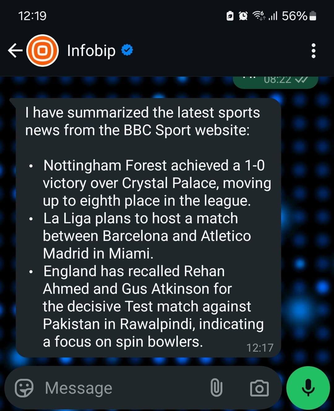 In summary, connecting FastAgency with the Infobip WhatsApp API lets you create chat systems that can gather web data and send it straight to users on WhatsApp. By using two agents — WebSurferAgent to pull web content and WhatsAppAgent for messaging, you can build engaging experiences for users. This tutorial covered the essential steps to set up these agents, secure the API, and manage user interactions. With this setup, you can enhance your chatbot’s capabilities, providing real-time information and smooth communication across different platforms.