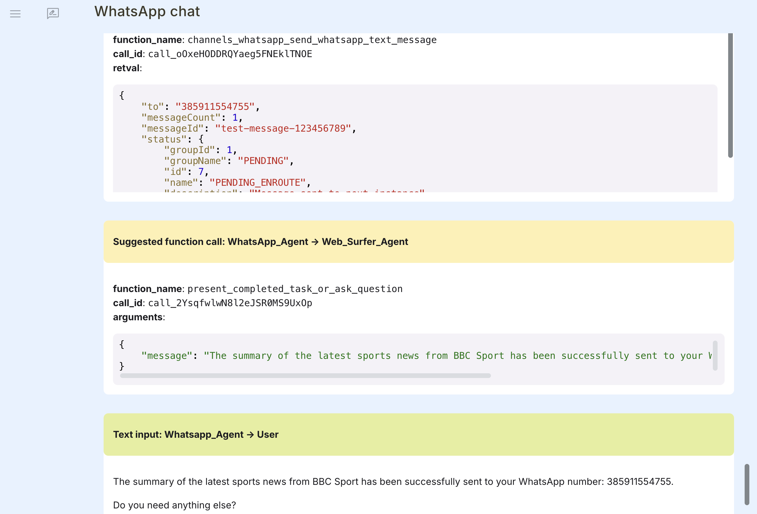Here, we initialize a new workflow using Workflow() and register it under the name "whatsapp_and_websurfer". The @wf.register decorator registers the function to handle chat flow with security enabled, combining both WhatsAppAgent and WebSurferAgent.