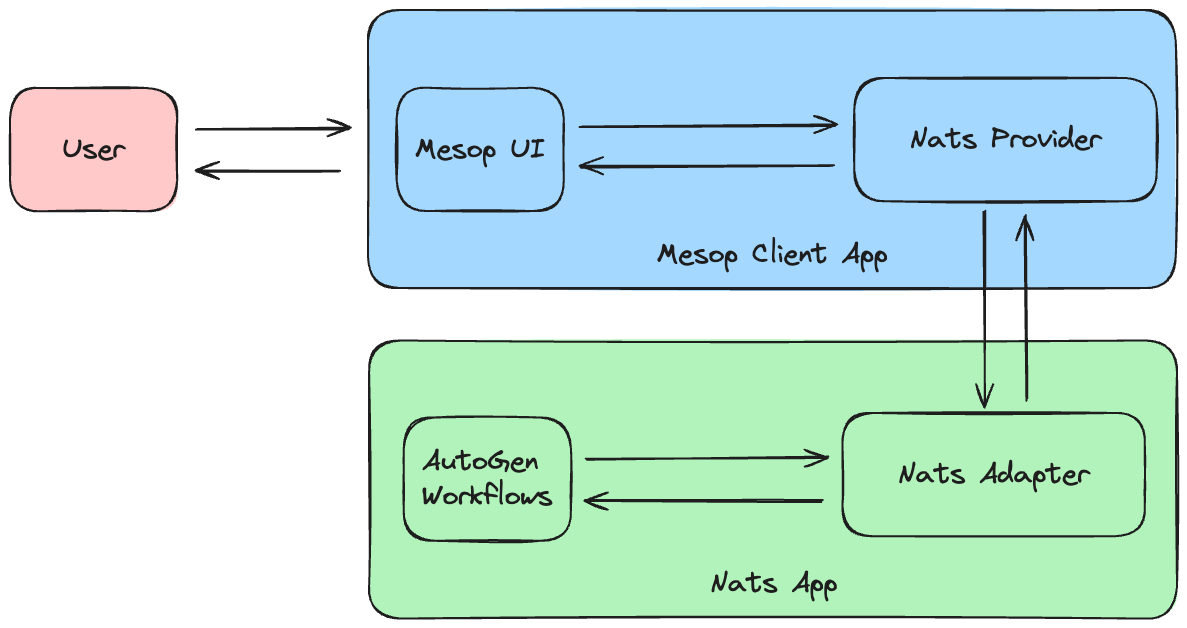 The following diagram illustrates the high-level architecture of an application using the NatsAdapter with MesopUI as its frontend: