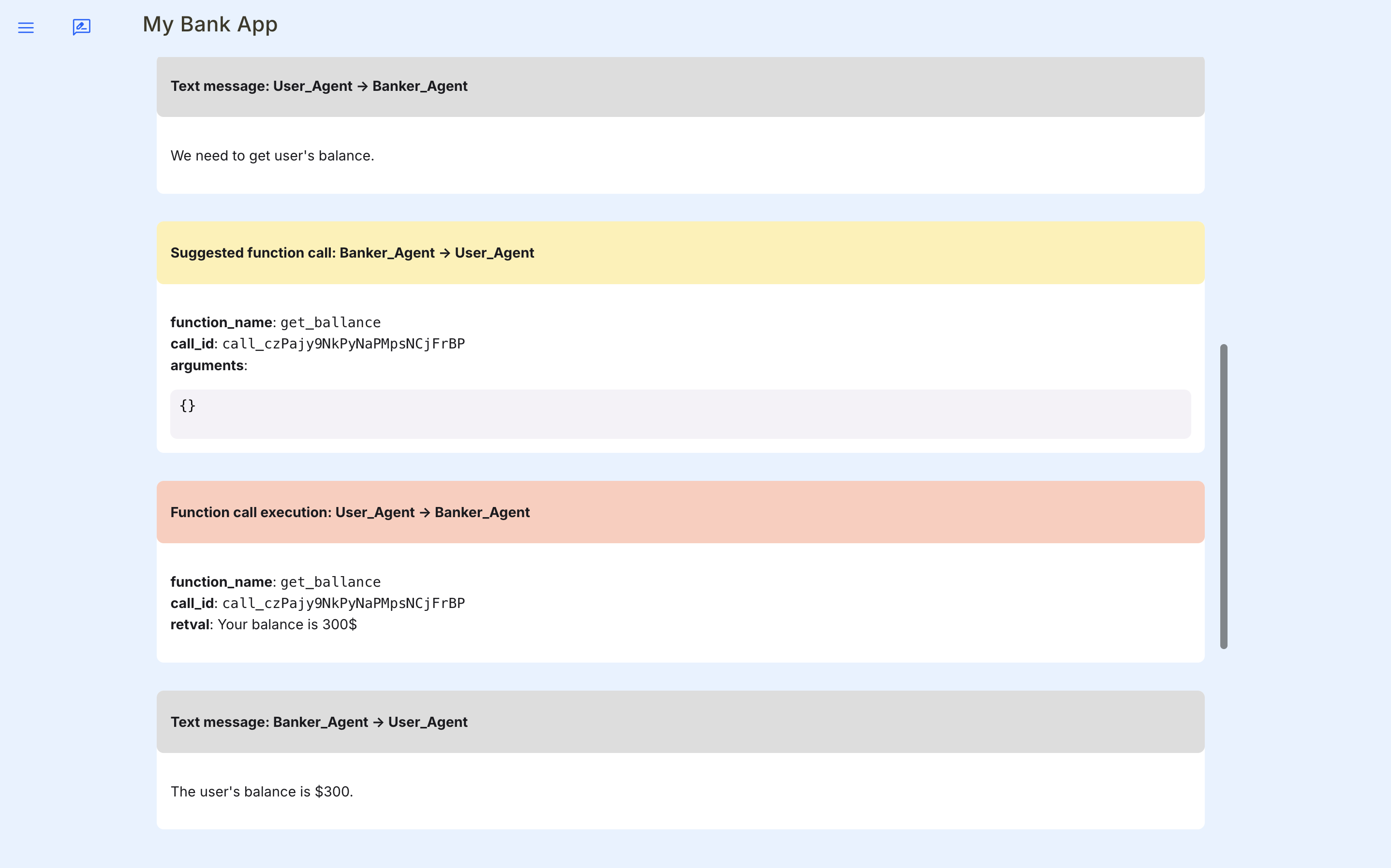 Here, the user agent initiates a chat with the banker agent, which retrieves the user's balance. The conversation is summarized using a method provided by the LLM.