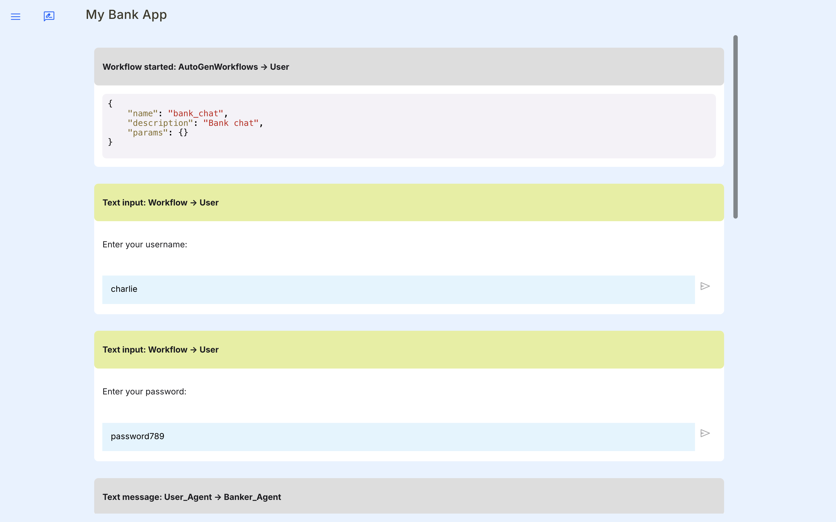 The bank_workflow handles user interaction and integrates agents to retrieve balance securely.