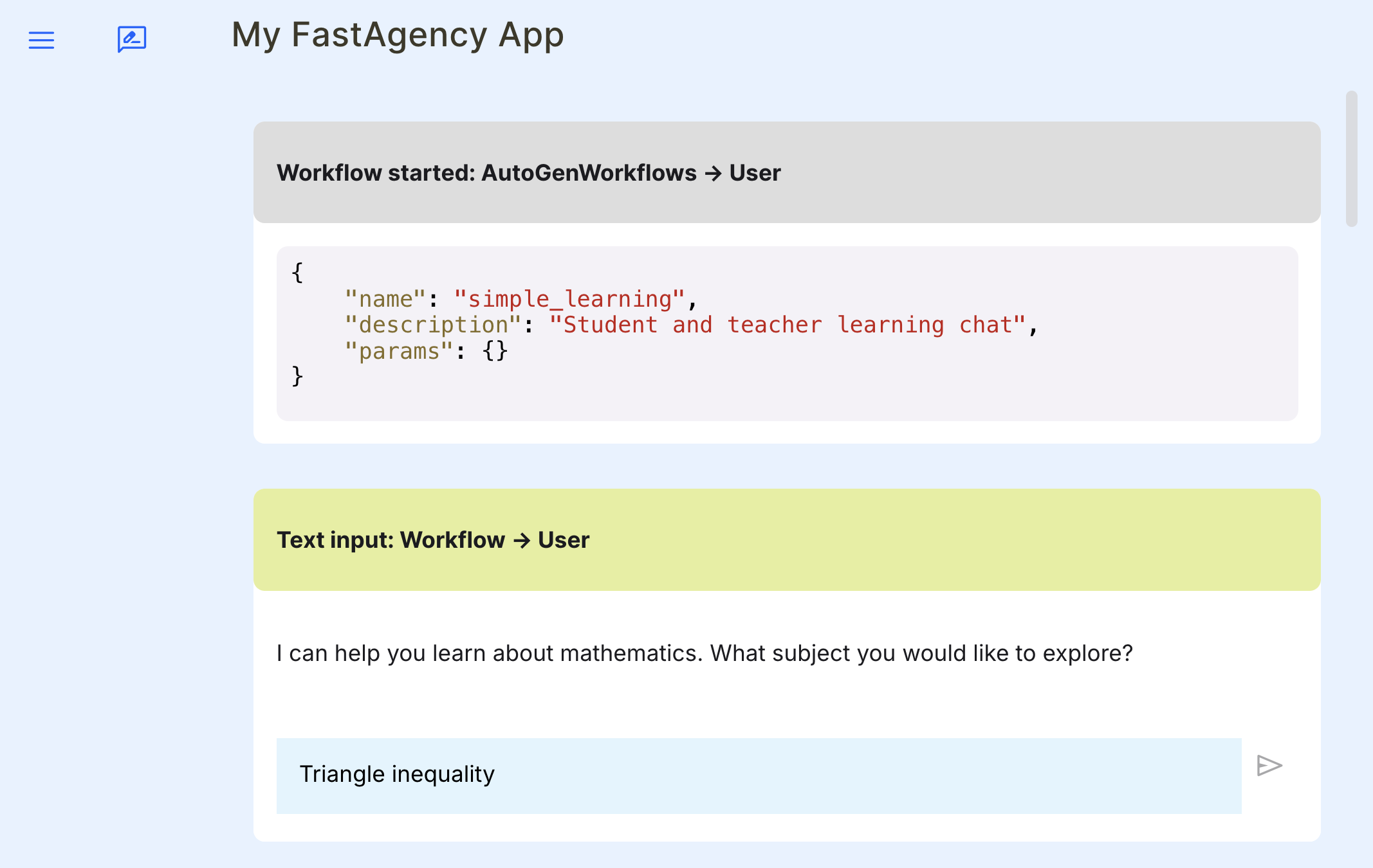 To ensure that the workflow we have defined is working properly, we can test it locally using MesopUI. The code below can be found under my_fastagency_app/local/main_mesop.py and imports the defined workflow and sets up MesopUI: