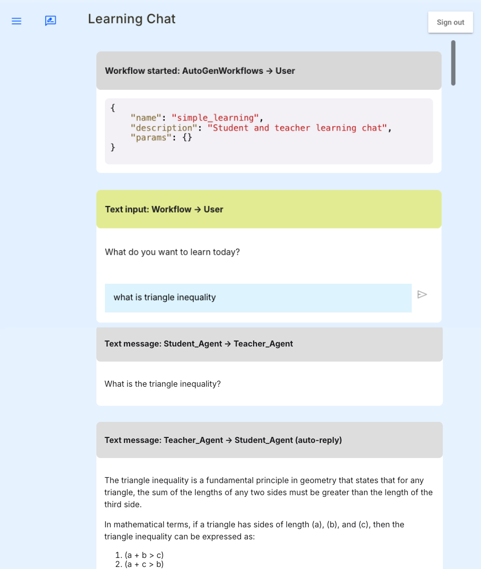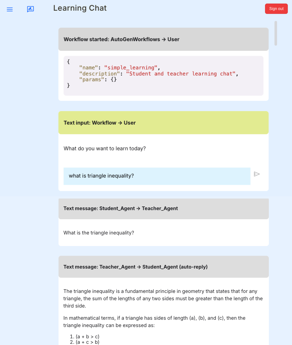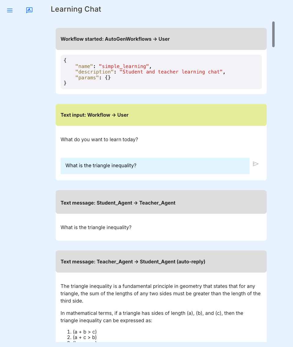 This example shows how to create a simple learning chat where a student agent interacts with a teacher agent. The student asks questions, and the teacher provides responses, simulating a learning environment. The conversation is facilitated through the web interface using MesopUI.